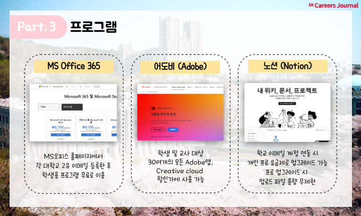 과제를 하다 보면 다양한 프로그램들을 사용해야 할 때가 많아지는데요. 학교 이메일을 발급받은 모든 대학생이라면 MS오피스 홈페이지에서 가입 시 각 대학교에서 발급하는 고유 이메일을 등록한 후 학생용 프로그램을 무료로 이용할 수 있습니다. 실제로 저 또한 Office 365 무료 세트를 설치하여 과제를 할 때 유용하게 사용하고 있답니다. 다음으로 어도비에서 학생과 교사를 대상라면 30여개의 모든 Adobe 앱과 1백 GB 작업공간이 포함된 Creative Cloud를 60% 할인 혜택으로 사용할 수 있습니다. 1년동안 해지는 불가하다고 하니 이 점 꼭 유의하시기 바랍니다! 노션은 노트 필기나 연구자료, 할 일들을 유용하게 정리할 수 있는 프로그램인데요. 학교 이메일 계정을 연동하면 개인 프로 요금제로 업그레이드를 할 수 있고, 프로로 업그레이드를 하면 업로드 파일 용량을 무제한으로 사용할 수 있습니다.