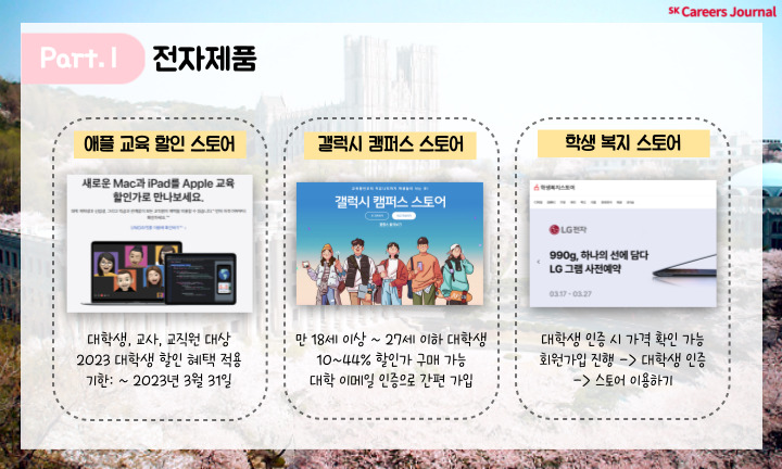 새로운 노트북이나 태블릿을 사야하는데 가격이 부담이라면, 지금 바로 스토어에서 대학생 인증 후 할인을 받을 수 있습니다. 애플 교육 할인 스토어에서는 3월 31일까지 맥북, 아이패드, 애플 펜슬 등 제품 할인과 애플 케어 플러스를 20% 할인하고 있습니다. 구매확정 전에 필요한 첨부 서류를 제출해야 하며, 필요 서류에는 정보 공개 동의서, 재학증명서 등이 있습니다. 갤럭시 캠퍼스 스토어는 만 18세 이상부터 27세 이하 대학생이라면, 대학 지정 이메일 인증으로 간편 가입을 통해 전자제품을 10%에서 44%까지 할인가로 구매할 수 있습니다. 입학 예정자라면 서류 인증을 통해 가입할 수 있습니다. 학생 복지 스토어는 대학생 인증 시 애플, 삼성, LG등의 제품들을 할인된 가격으로 구매할 수 있습니다.