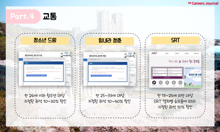 대학생이라면 KTX와 SRT를 할인된 가격으로 탈 수 있다는 사실! 알고 계셨나요? 레츠 코레일 홈페이지 로그인 -> 마이페이지 -> 할인서비스 대상 자격 등록내역 -> 등록 과정을 통해 할인혜택을 받을 수 있습니다. 청소년드림은 만 24세 이하의 청년들을 위한 할인으로 KTX 열차별 승차율에 따라서 최소 10%부터 최대 30%까지 할인 받을 수 있습니다. 힘내라 청춘은 만25세부터 33세의 청년이라면 KTX 열차별 승차율에 따라서 최소 10%부터 최대 40%까지 할인 받을 수 있습니다. SRT는 만 13세부터 25세 미만을 대상으로 SRT 열차별 승차율에 따라 지정된 자석을 10% 할인 받을 수 있습니다.