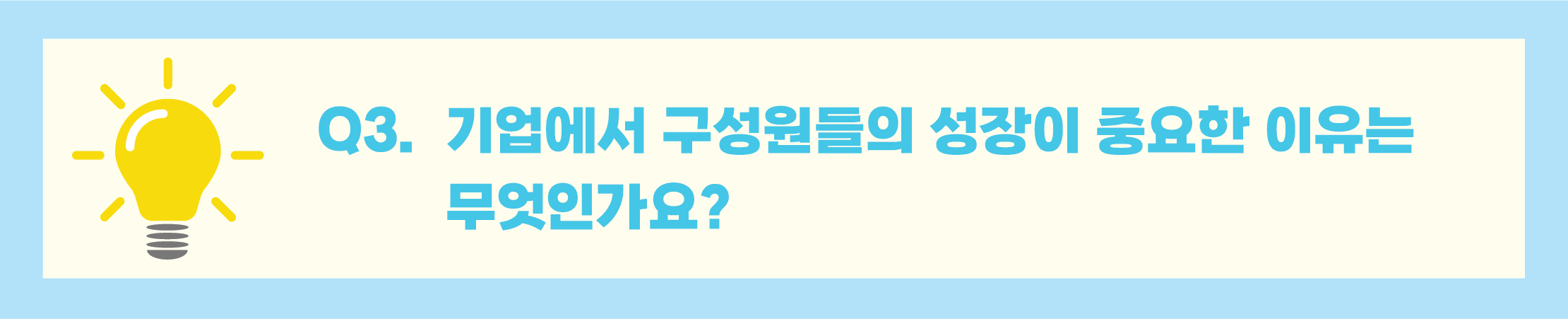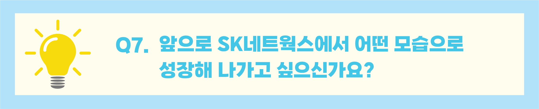 최근 트렌드를 보아도 회사 생활을 통한 개인의 ‘성장’이 화두입니다. 연봉이나 복리후생 등 물질적 보상 외에 ‘성장’을 통해 행복감을 느끼는 분들이 늘어나고 있다는 이야기입니다. 또한 SK의 경영철학인 SKMS에서도 경영의 궁극적인 목표는 구성원들의 행복이라 정의하고 있습니다. 이러한 관점에서 보았을 때, SK는 당연히 구성원들의 성장을 중요하게 생각해야 하며, 다양한 워크숍이나 기업 문화 활동을 통해 ‘내가 회사 생활을 하며 성장하고 있구나’를 인식할 수 있도록 노력하고 있습니다.
