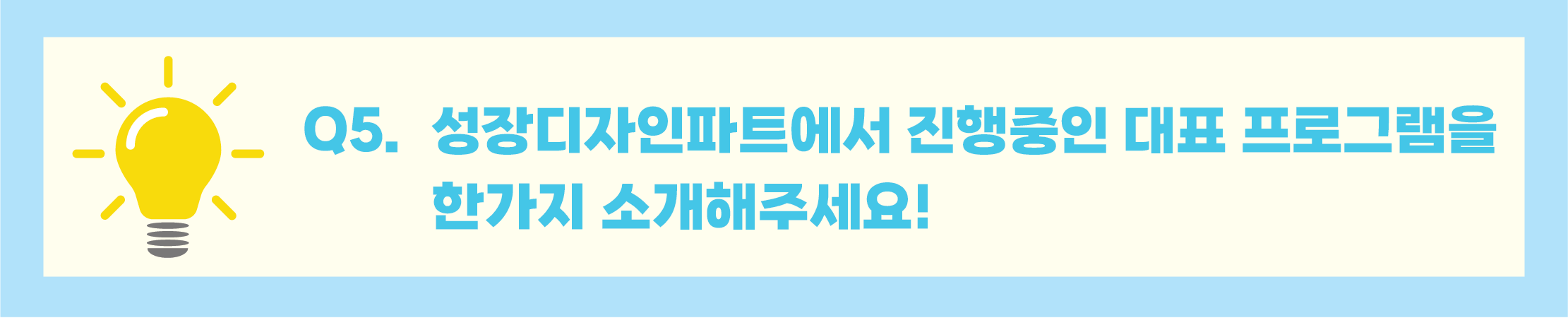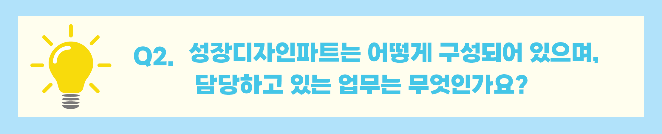 성장디자인파트에서는 HRD영역인 구성원 교육 콘텐츠 기획, HR제도 운영, 그리고 구성원들을 중심으로 HR제도를 개선하는 활동 등 기업 문화 활동을 진행합니다.