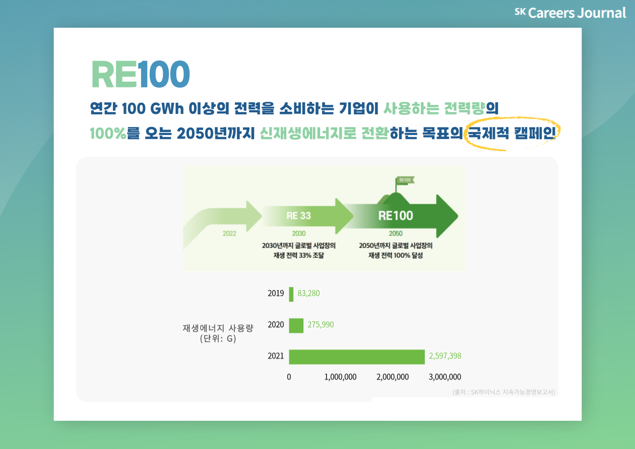 한국의 ESG 선도주자답게 SK하이닉스는 2020년 국내 반도체 업계 최초로 RE100에 가입하고, 2050년까지 재생에너지 사용률 100%를 달성할 것을 선언하였습니다. 많은 전력을 산업의 원동력으로 하는 반도체 업계에서 재생에너지로 전체 전력을 조달하는 것은 도전적인 목표가 아닐 수 없지만, 재생에너지 사용률 100% 달성 선언과 RE100 가입을 통해 SK하이닉스는 글로벌 기후 위기의 심각성을 인지하고, 이에 적극적으로 대응하고자 한다는 강력한 의지를 표현하였습니다.