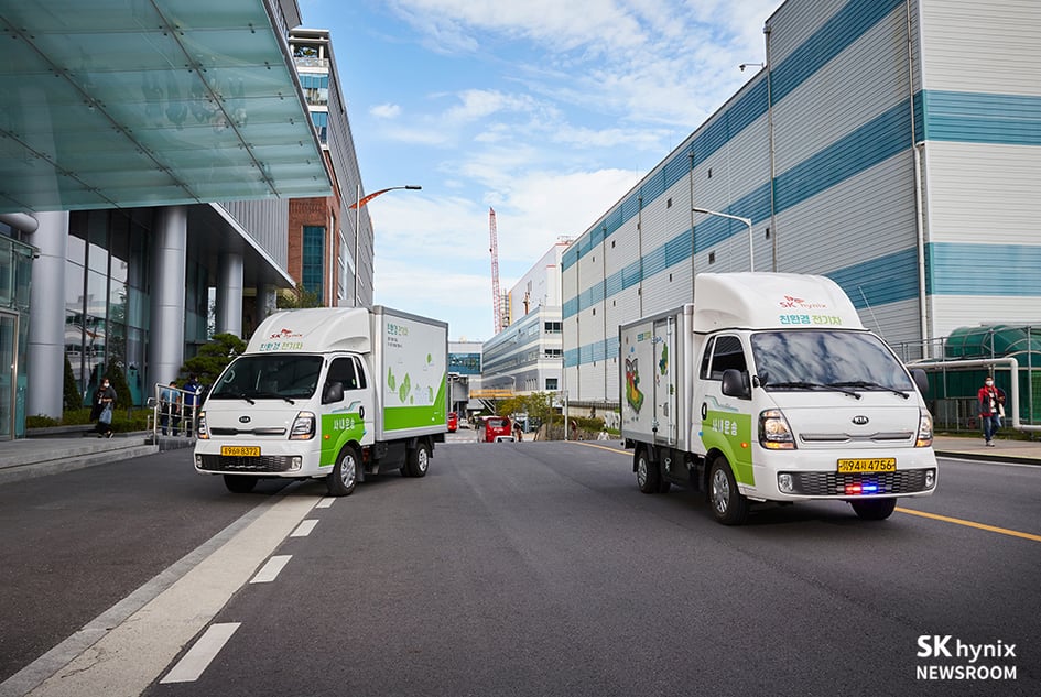 따라서 이러한 문제를 해결하기 위해, SK하이닉스에서는 2020년부터 사업장 내부에서 운행 중인 화물 운송 차량들을 전기자동차로 교체하는 작업을 시작하였습니다. 작업 시작 당시, 전체 100여 대 차량 중 40대에 해당하는 소형 1톤 트럭부터 단계적으로 교체하기로 하고, 배기 장치가 노후한 차량 10대를 선정하여 먼저 교체 작업을 진행하였습니다.
