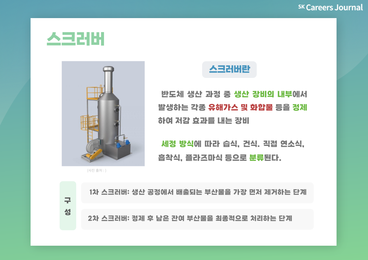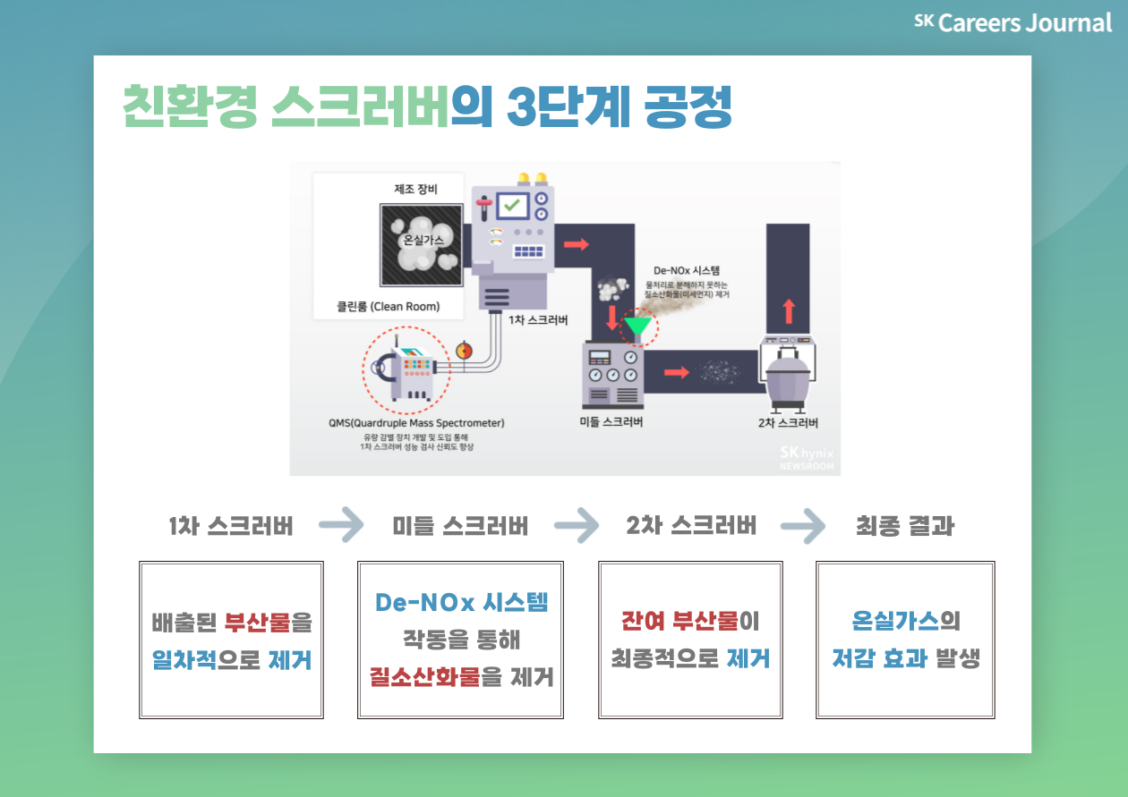 SK하이닉스는 과불화탄소(PFCs)·아산화질소(N2O) 등 온실가스의 원인이 되는 공정 가스를 3단계에 걸쳐 효과적으로 분해하는 ‘친환경 스크러버 장비’를 개발하였습니다. 새롭게 개발된 ‘친환경 스크러버’는 기존 스크러버에 존재하는 1차와 2차 스크러버 사이에 De-NOx 시스템을 활용하는 미들 스크러버를 추가한 형태를 나타냅니다.