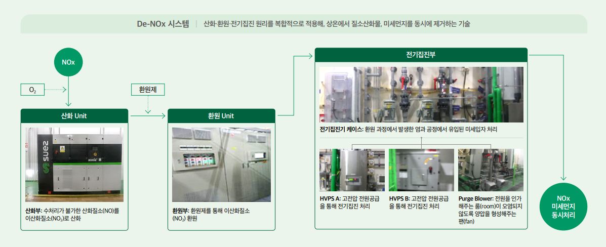 De-NOx 시스템이란 미세먼지의 원인 중 하나인, 질소산화물(NOx)을 제거할 수 있도록 하는 기술입니다. 산화∙환원∙전기집진 원리를 복합적으로 적용하는데, 이산화질소(NO2)로 산화된 산화질소(NO)를 다시 환원시키는 과정에서 발생한 염과 공정에서 유입되는 미세입자를 전기집진으로 동시에 처리할 수 있게 원리의 시스템입니다. 이러한 SK하이닉스의 친환경 스크러버는 실제로 온실가스 배출량을 무려 90% 감소시키는 효과를 가져왔다고 합니다.
