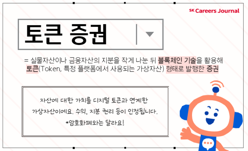 아아, 먼저 토큰 증권이 낯선 분들도 계실 것 같은데요. 토큰증권은 간단하게 정의해서 실물자산이나 금융자산의 지분을 작게 나눈 뒤 블록체인 기술을 활용해 토큰(Token, 특정 플랫폼에서 사용되는 가상자산) 형태로 발행한 증권입니다. 즉 주식이나 채권과 같은 자산에 대한 가치를 디지털 토큰과 연계한 가상자산이라고 할 수 있습니다. 그래서 수익, 실물 자산에 대한 지분 권리 같은 것들이 인정되죠. 이러한 점에서 가상자산인 암호화폐와는 다르답니다!