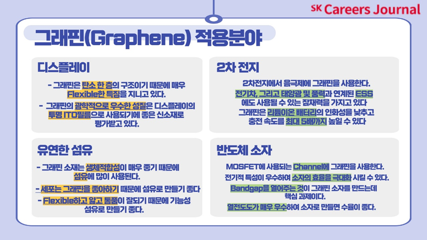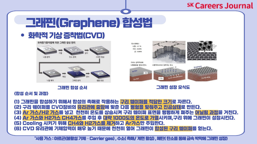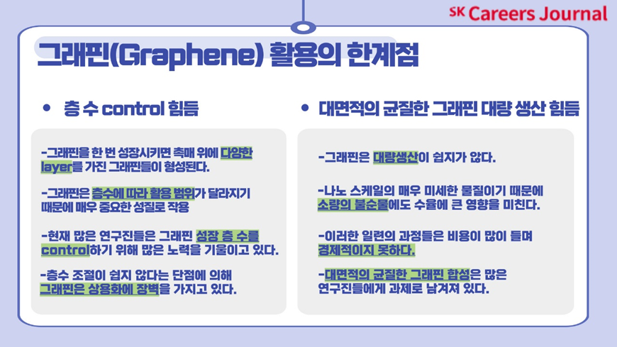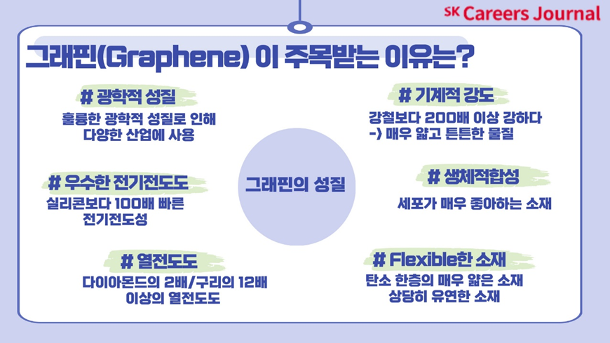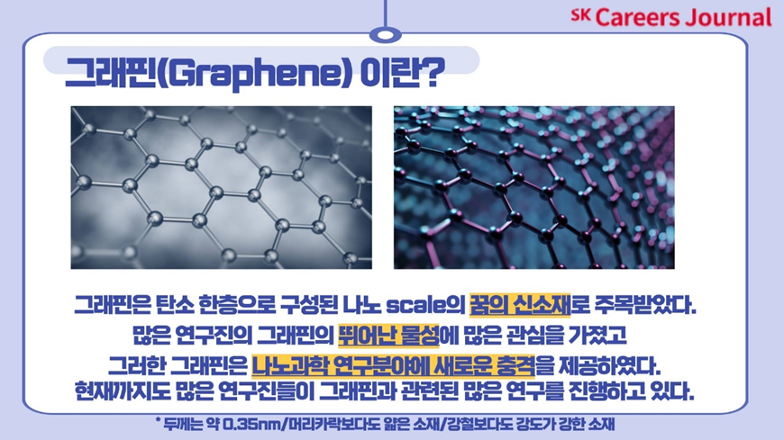 네,오늘은 저와 함께 알아보았던 ’꿈의 신소재 그래핀‘이었는데요,어떠셨나요 많이 유익하셨나요? 이렇듯 현재의 연구진들은 더 나은 미래를 꿈꾸며 그래핀 상용화를 위해 많은 노력을 기울이고 있습니다. 현재의 다양한 연구들은 언젠가 미래의 나노 전자의 새로운 시대를 가져올 것으로 많은 이들이 기대하고 있답니다! 어떤 새로운 미래가 펼쳐질지 여러분들도 많은 관심을 가지고 함께 지켜본다면 좋을 것 같네요!지금까지 SKCE였습니다. 더 재미있고 유익한 기사로 돌아오겠습니다! 감사합니다!