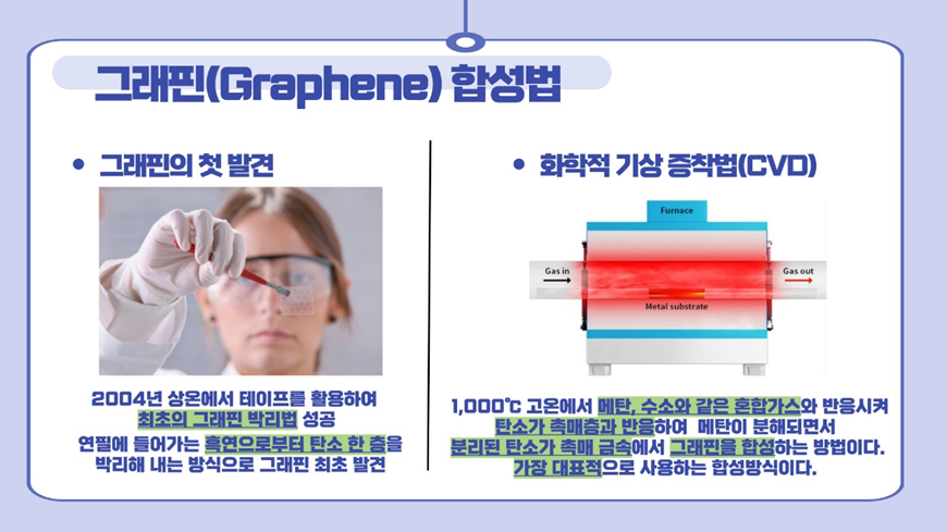 그러한 몇가지의 합성법이 더 발견되었지만 질 좋은 다량의 그래핀을 생산하는데에는 많은 한계가 있었습니다. 하지만CVD라는 화학적 기상증착법을 통해 그래핀을 성장시키는 방법을 발견하면서 그래핀에 대한 새로운 가능성이 열렸습니다.