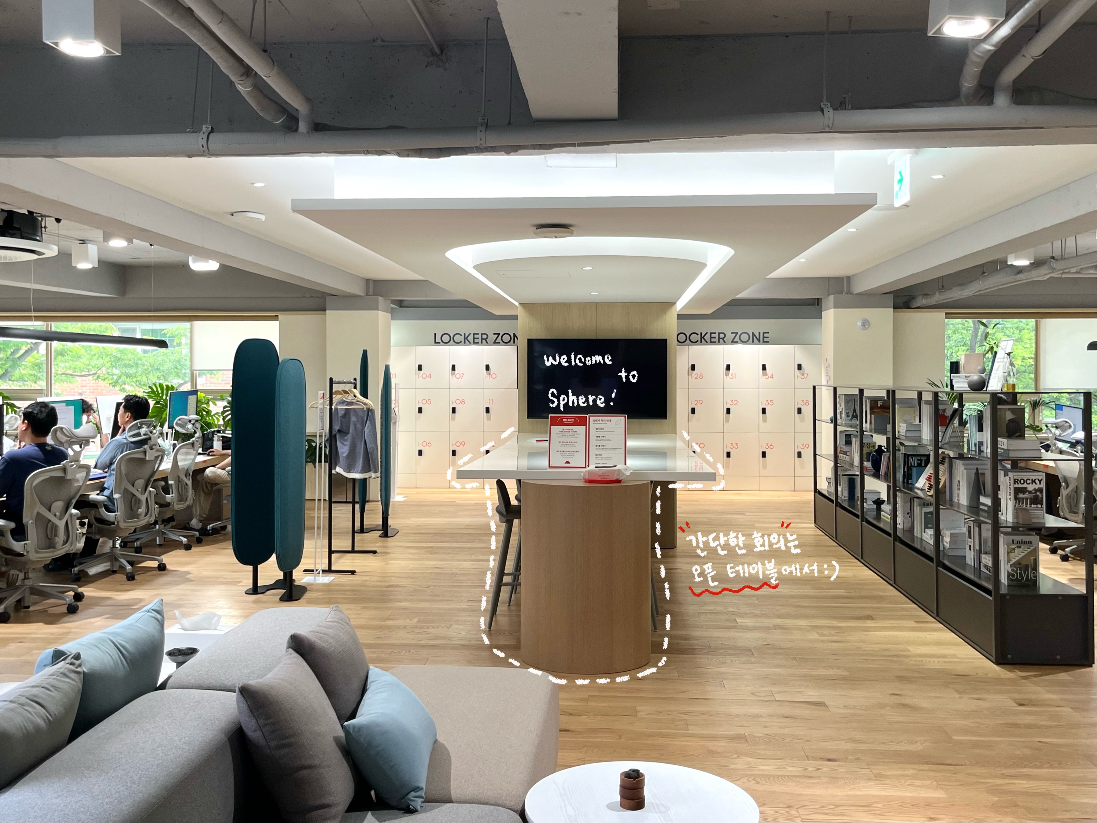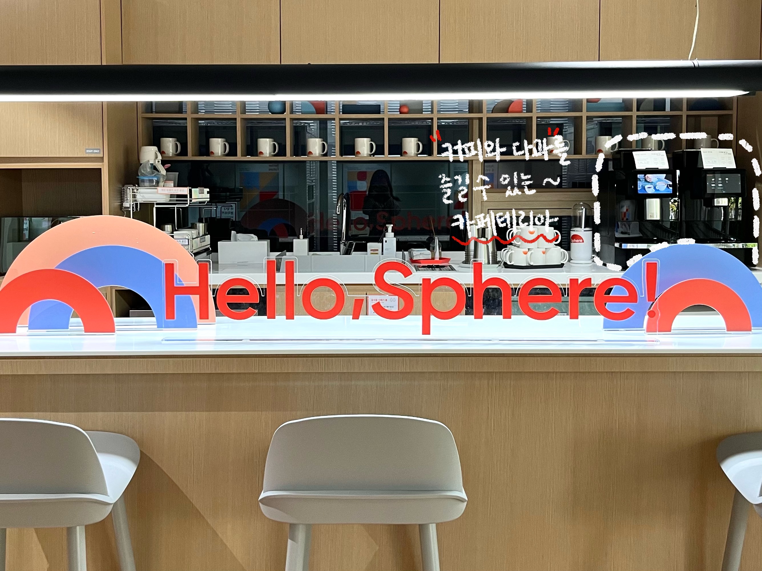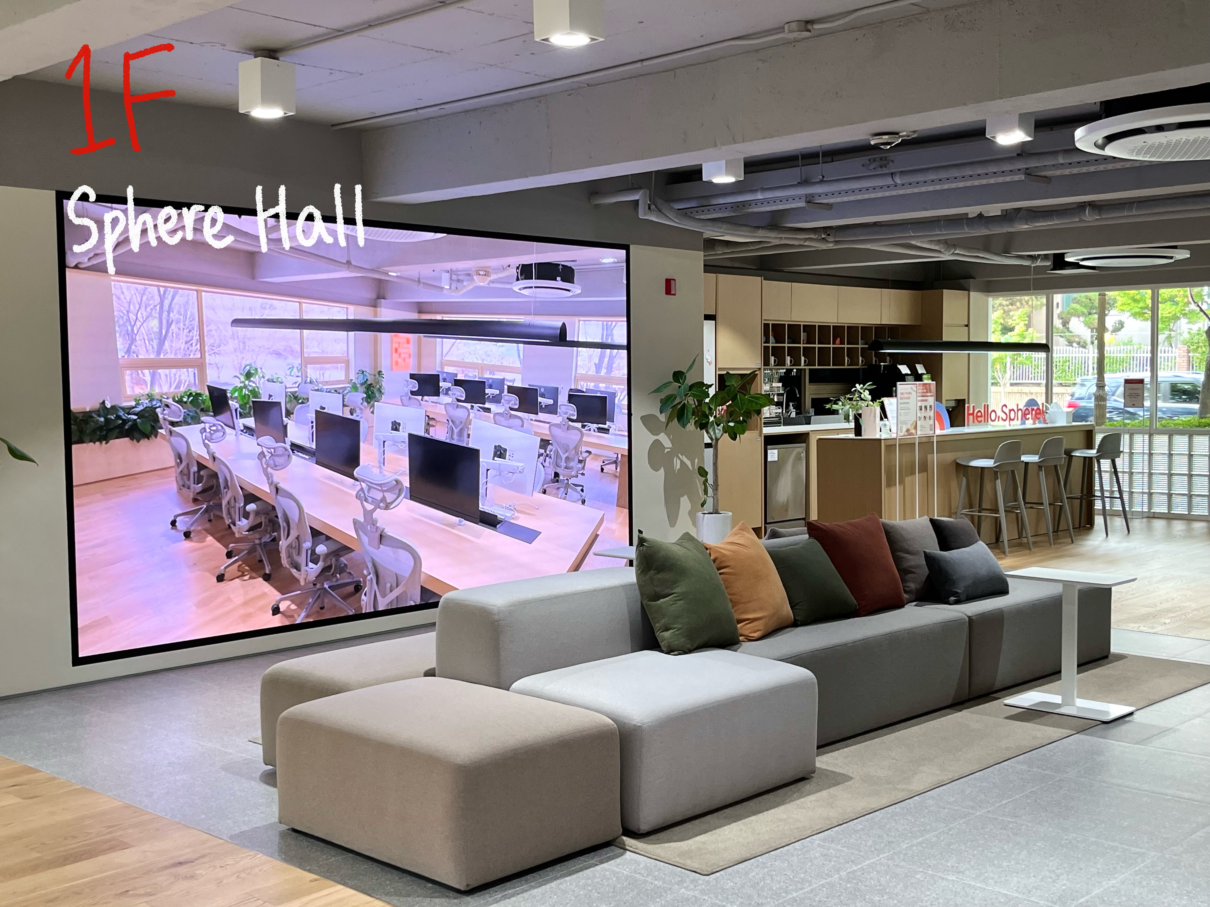 이렇게 출입 게이트를 무사히 지난 뒤, 마주하게 된 1층의 모습! 들어서자마자 대형 스크린과 함께 Sphere Hall이 출근한 CE를 맞이해주었습니다.