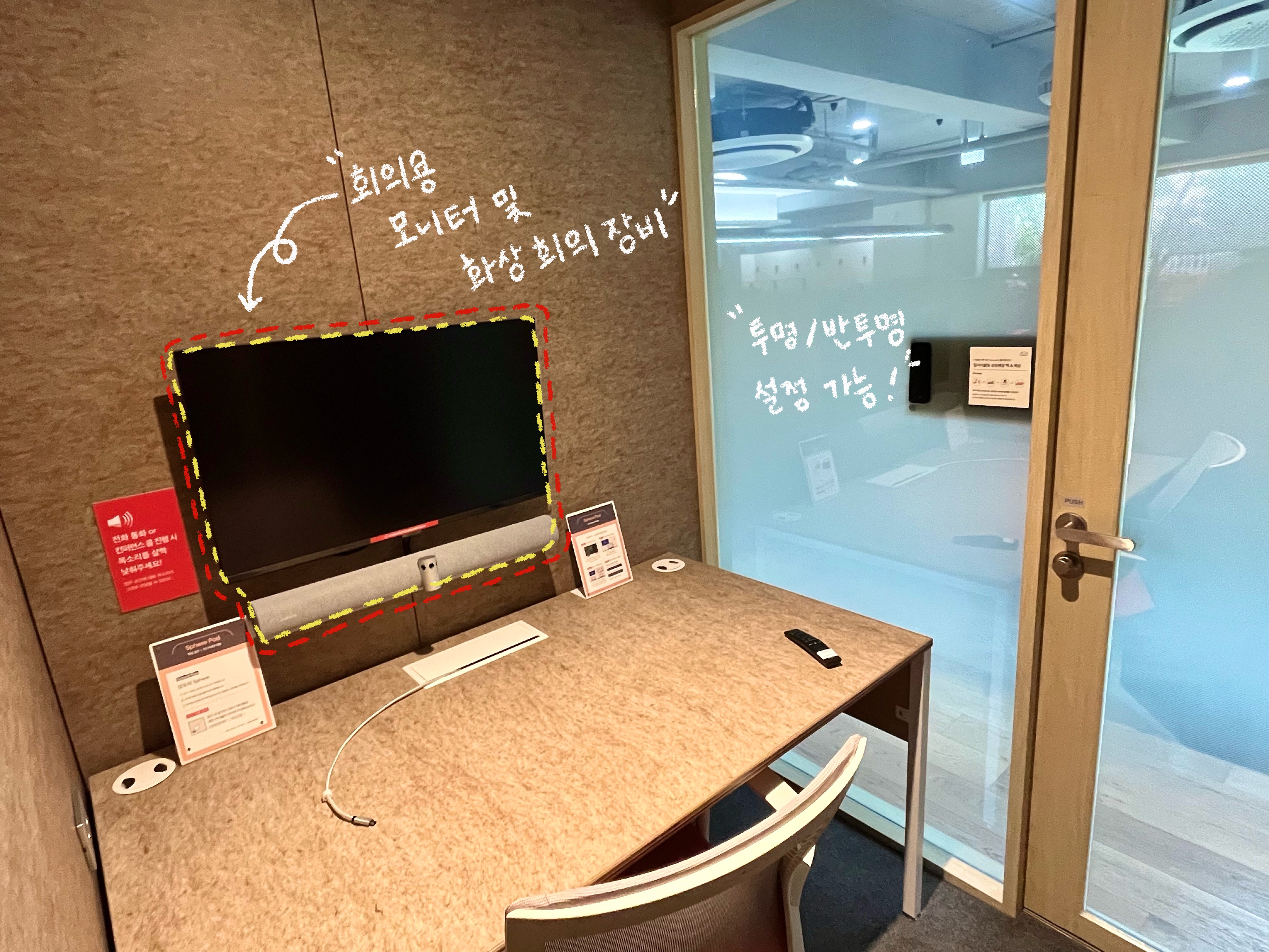 그 외에도, 혼자서 잠시 간단한 업무 전화를 받을 수 있는 Phone 부스와 다인용 미팅룸까지 준비되어 있으니, 업무 상황과 유형에 따라 유연하게 선택한다면 더 효과적인 미팅 진행이 가능하겠죠?