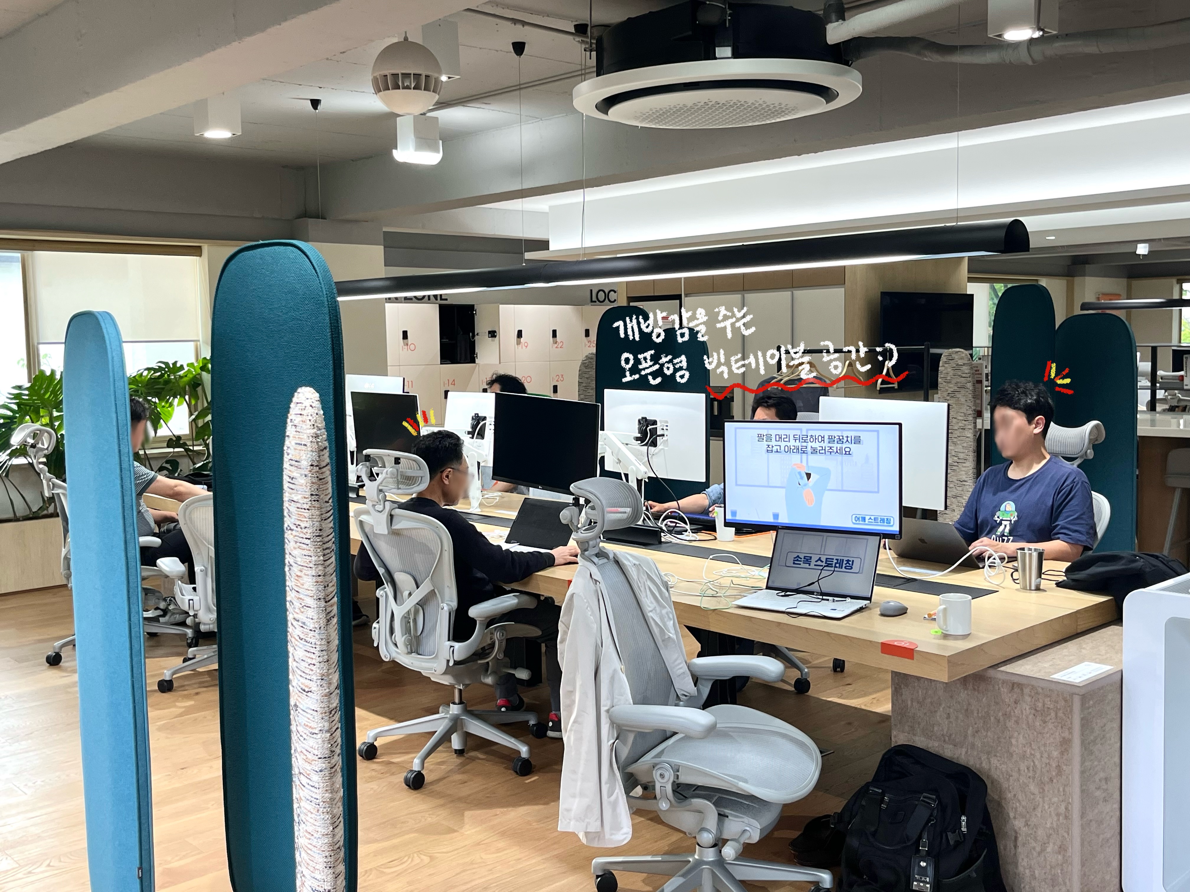 오늘은 왠지 혼자만의 집중할 수 있는 공간에서 일을 하고 싶은 CE는 3층으로 발을 옮겼습니다. 3층에 도착하니 수많은 독립된 아일랜드 책상들에서 벌써 열심히 업무를 진행하고 계시는 구성원 분들을 볼 수 있었는데요.
