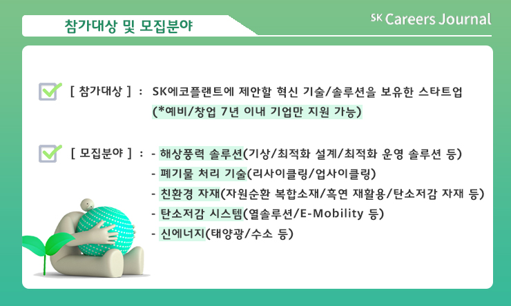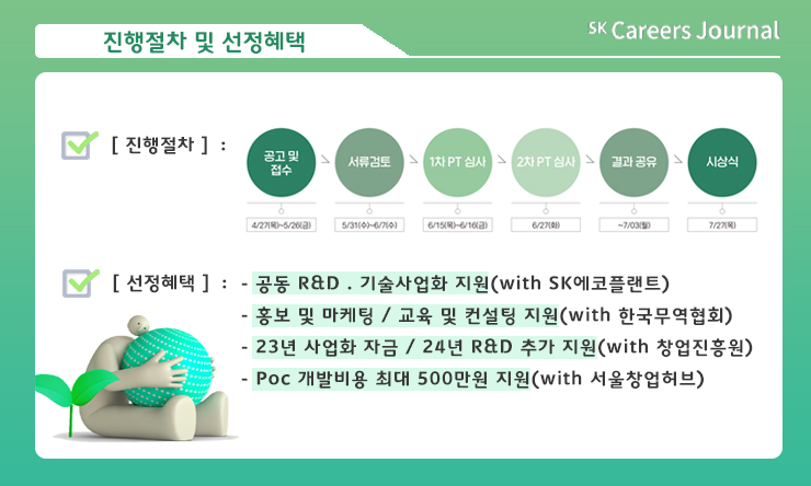 그렇다면 이 모든 과정을 거쳐 선정된 우수한 스타트업은 과연 어떤 혜택을 누리게 될까요? 이번 공모전에서 최종적으로 선정되면 중소벤처기업부(창업진흥원)를 통해 기술개발에 대한 자금지원이 이루어질 예정이며, 이 과정에서 SK에코플랜트는 공동으로 기술을 개발하고 실제 프로젝트에 적용할 수 있는지에 대한 가능 여부 검토를 거쳐 기술을 사업화할 수 있도록 많은 기회를 제공할 예정이라고 합니다.