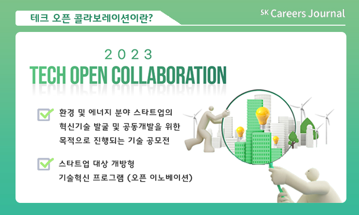 SK에코플랜트가 지난 4월 27일부터 5월 26일까지 약 한 달간 환경·에너지 분야 스타트업을 육성하고 관련 기술을 발굴 및 공동 개발하기 위한 ‘테크 오픈 콜라보레이션’을 개최했다는 소식 들으셨나요? 다양한 스타트업이 이에 지원한 가운데 앞으로 많은 선발 과정을 거쳐 여러 혁신 기술을 선보일 것으로 기대를 모으고 있습니다. 오늘은 SK에코플랜트가 스타트업을 육성하기 위해 어떻게 노력하고 있는지, 그리고 전망은 어떠한지 함께 살펴보도록 하겠습니다.