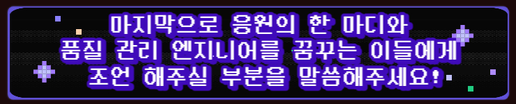 오랜 기간 품질관리 업무를 해보니 품질을 최우선으로 생각하는 마음가짐이 가장 중요하다고 생각해요. 직무 이해 능력과 커뮤니케이션도 중요하고 필요하지만 품질관리의 기술적인 부분은 입사 후 교육과 현업을 통해 충분히 배울 수 있어요. 허나 품질에 대해 외부의 유혹을 뿌리치고 부적절한 부분과 타협하지 않고 올곧게 나아갈 수 있는 마인드를 탑재하는 게 훌륭한 품질관리 엔지니어가 되는 지름길이라고 생각해요.