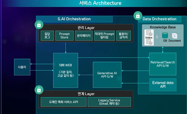 AI Orchestration의 관리 Layer에서는 사용자 관리, 프롬프트 관리 등의 체계를 구축해 악의적인 사용자를 제어하거나 프롬프트(prompt) 모니터링을 통해 적대적인 프롬프트(prompt)를 필터링합니다. 연계 layer는 기존의 도메인 특화 서비스나 Legacy Service과의 연동체계로, 이를 통해 최종적으로 실제 업무와 연계된 시스템을 구축할 수 있게 됩니다. 이처럼 SK㈜ C&C는 생성형 AI를 활용한 기업용 엔터프라이즈 서비스를 제공하고자 합니다.