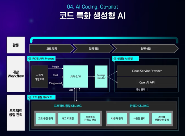 코드 특화 생성형 AI 서비스를 제공하고자 합니다. 일반화된 AI 모델의 질의와 답변뿐만 아니라 자체 AIP와 prompt를 통해서 사용자별/프로젝트별/고객별 설정을 적용해 그에 맞는 답변을 생성하도록 합니다. 코딩에 도움을 주는 것부터 사용자별 사용기록, API와 질답내용을 수집하여 project 관리자가 진척도와 코드 완성도를 더 쉽게 파악할 수 있는 대시보드도 제공할 것입니다.