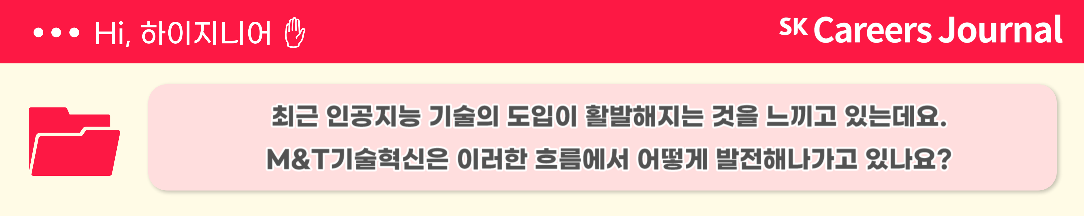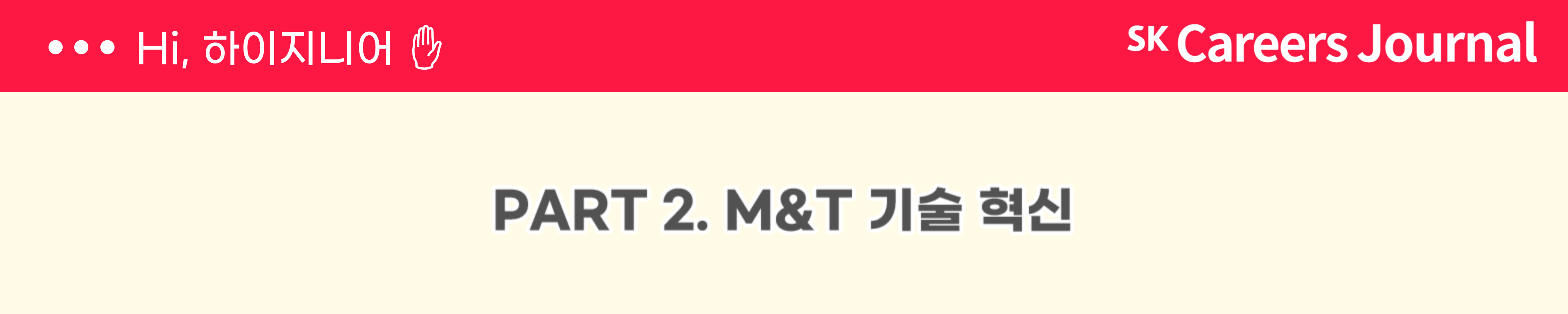 양산 기술 직무에서는 다시 단위공정기술/소재기술/장비개발/M&T기술혁신/Defect Engineering으로 나뉘는데요, 오늘은 그중에서도 단위공정기술과 M&T 기술혁신 업무를 맡고 계신 박민수, 김용경 TL 님을 인터뷰해 보았습니다. SK Careers Journal에서만 볼 수 있는 특급 인터뷰, 지금 바로 만나러 가보시죠!