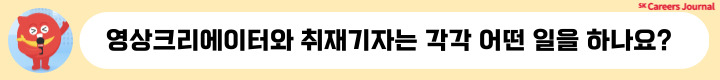 영상크리에이터는 인터뷰를 통해 영상을 제작하고, 취재기자는 인터뷰 내용을 바탕으로 기사를 작성합니다. 영상크리에이터와 기자가 같은 주제로 콘텐츠를 제작하는 경우가 있고 다른 주제로 진행을 하는 경우도 있습니다. 영상크리에이터는 영상을 매개체로서 다양한 정보를 더욱 생생하게 전달하고, 취재기자는 글을 매개체로 하여 생동감 있게 정보를 전달할 수 있도록 기사를 작성하고 있습니다. 영상 제작과 기사 작성 중 본인이 더 잘 할 수 있다고 생각하는 분야를 생각해보고, 영상 크리에이터, 취재기자 중에 선택하여 지원하면 좋겠죠?