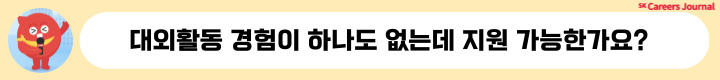 네! 가능합니다~ 대외활동 경험이 없더라도 교내 학생회 활동, 동아리 활동 등 다양한 활동 경험을 바탕으로 CE로서 필요한 역량을 어필해서 지원서를 작성할 수 있습니다. 예를 들어 1팀 CE의 경우, 교내 활동을 하면서 만들어 보았던 카드뉴스를 면접 때 보여드리며 콘텐츠 제작 역량과 함께 타 프로그램에서 인터뷰를 했던 경험을 바탕으로 의사소통능력에 대해 어필했습니다. 꼭 관련된 경험이 아니더라도 다양한 경험을 통해서 배운 점이나 느낀 점을 SKCE로 활동하면서 어떻게 긍정적으로 적용할 수 있을지 기술한다면 대외활동 경험이 없더라도 충분히 합격할 수 있다고 생각합니다.