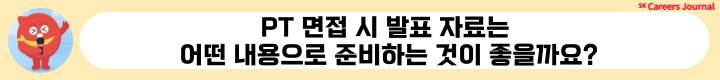 발표 자료는 취재기자와 영상 크리에이터 모두 ‘본인이 직접 참여한 콘텐츠 1건’을 선정하여 기여도/사용 tool/얻은 효과 등에 대해 발표하는 것이었는데요. 취재기자의 경우 콘텐츠 제작 역량, 영상크리에이터의 경우 영상 제작 역량을 어필하는 것이 좋겠죠! 관련된 활동이 있다면 영상크리에이터의 경우 유튜브나 영상 콘텐츠, 취재기자는 카드뉴스 혹은 기사 콘텐츠를 제작했던 경험을 녹여서 자료를 제작하면 좋을 것 같습니다. 자신의 성실함이나 의사소통 능력을 드러낼 수 있거나 이러한 역량이 SKCE 활동에서 어떻게 적용될 수 있을지 어필하려고 노력하는 것도 좋을 것 같습니다. 관련 경험이 없더라도 CE로서 자신의 역량을 잘 보여줄 수 있는 발표자료라면 무엇이든 괜찮다고 생각합니다.