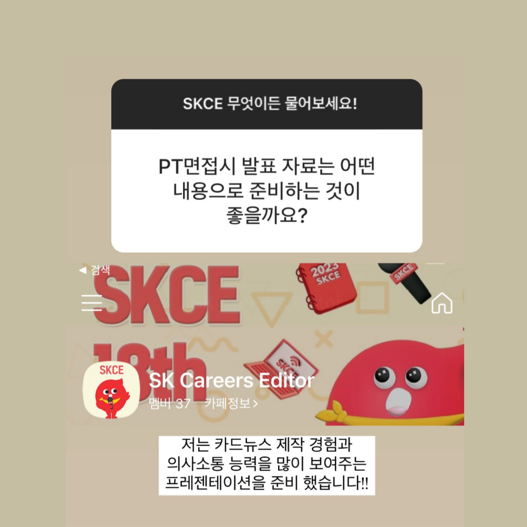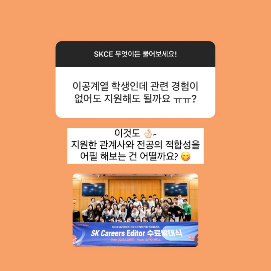 정예빈 CE: SKCE 이름에 맞게 ‘취준생’을 타켓으로 한 콘텐츠를 기획했는데, 아이디어나 취지가 SKCE에 맞아서 좋게 보였지 않을까 생각합니다.
