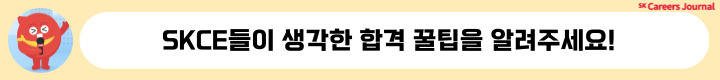 황수현 CE: 관계사에 대한 내용을 열심히 파악하고 SKCE에서 활동할 경우 지금까지 했던 스펙을 어떻게 녹일지에 대해 유연하게 설명했던 점이 합격하는데 도움이 된 것 같습니다 :)