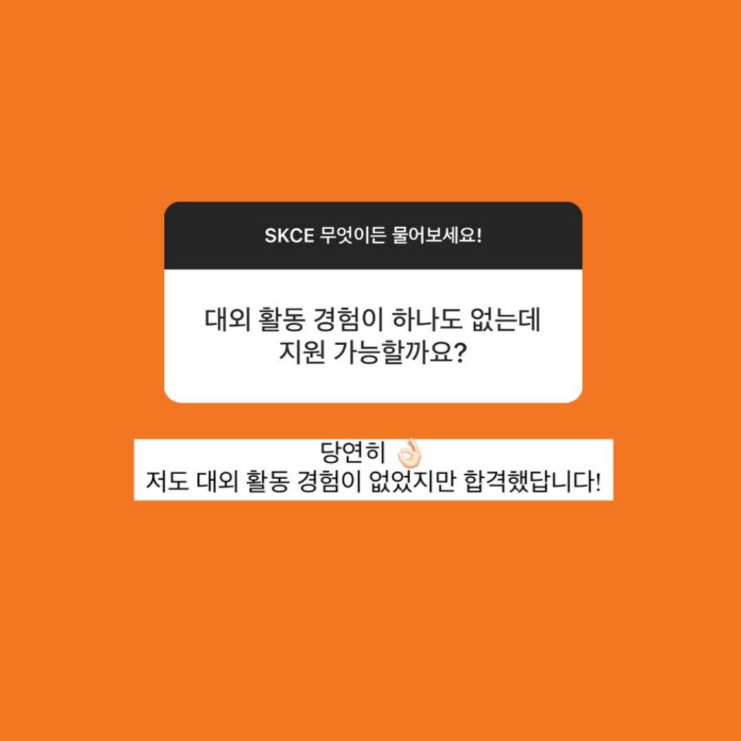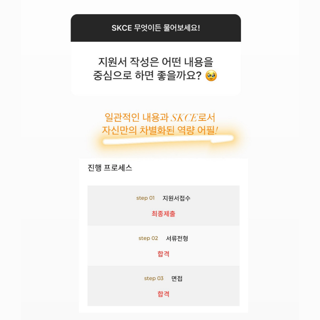 권나경 CE: 저는 SKCE에 대한 의지와 성실성을 정말 많이 어필했다고 생각합니다. 면접 때, 제가 정말 이 활동이 하고 싶고, 열심히 할 수 있다는 것을 어필하였습니다. 또한 이공계열이라는 저만의 장점을 살려서 만들 수 있는 콘텐츠들을 기획해서 구체적으로 말씀드렸던 기억이 있네요!