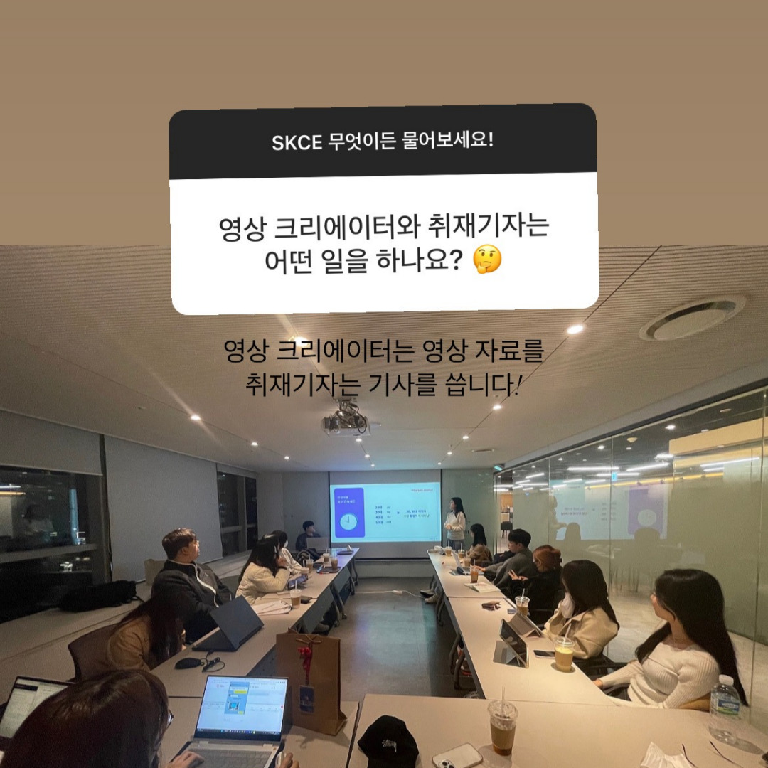 지원서는 본인이 가진 핵심 역량 몇 가지를 일맥상통하게 작성하는 것이 중요하다고 생각합니다. 특히 취재기자와 영상 크리에이터 모두 인터뷰를 진행해야 하기 때문에 의사소통 능력이 중요하다고 생각되는데요. 인터뷰 내용을 콘텐츠를 통해 전달하기 때문에 창의적이면서도 효과적인 콘텐츠 제작 역량도 함께 어필한다면 더욱 좋겠죠? 그래도 지원서에서는 진실성과 SKCE 활동에 대한 의지가 드러나도록 쓰는 것이 가장 중요하다고 생각합니다.