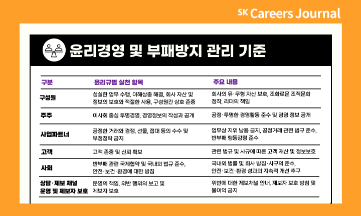 이사회는 윤리경영을 위해 준법지원인을 선임하여 운영하고 있으며, 준법지원인은 준법통제기준에 따라 활동을 수행하고, 정기적으로 감사위원회 또는 이사회에 보고하고 있습니다. 감사위원회는 독립적인 윤리경영 활동을 위해 내부 감사부서장(지속경영본부장)의 임면에 대한 동의권을 가지고 있으며, 내부 감사 관련 주요 규정의 제·개정, 내부 감사부서의 감사 계획 승인, 감사 결과에 대한 검토, 승인 및 피드백 제공 등의 권한을 행사합니다. 또한 CEO 직속 조직인 지속경영본부 내 준법경영팀은 컴플라이언스 및 내부 감사 업무 등의 윤리경영 활동을 수행하고 있습니다.