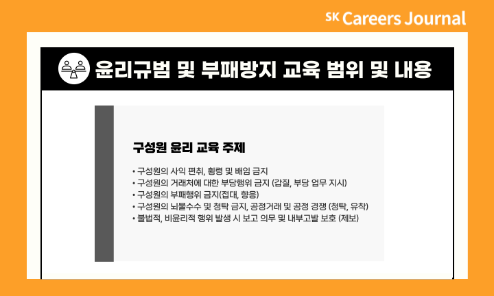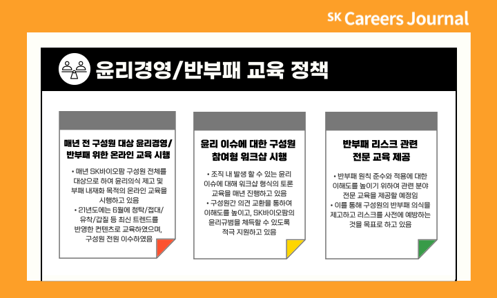 SK바이오팜은 구성원의 윤리경영 실천 의지를 강화하기 위해 연 1회 이상 전체 구성원을 대상으로 윤리경영 온라인 교육 및 윤리 실천 워크숍을 실시하고 있습니다. 이와 더불어 윤리경영 실천 수준을 제고하기 위해 구성원 대상 윤리 실천 설문과 신규 및 경력 입사자 대상 컴플라이언스 특화 교육도 실시하고 있습니다. 또한 시장 내 질서와 비즈니스 파트너와의 거래 시 유의 사항을 포함한 윤리실천 서약서, 공정투명거래동의서를 함께 작성하고 있습니다. SK Life Science의 경우 전체 구성원을 대상으로 윤리규범과 뇌물 및 부패방지 정책에 대한 교육을 의무화하며, Learning Management System과 Compliance Wire를 통해 구성원의 교육 이수 실적을 관리하고 있습니다.