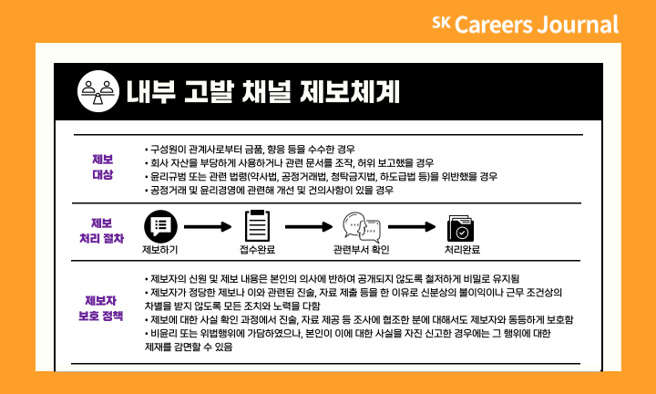 SK바이오팜은 윤리규범 및 실천지침, 반부패 행동강령을 제·개정하여 모든 경영활동에서 구성원의 의사결정과 행동의 판단 기준으로 삼고 있습니다. 또한 모든 이해관계자가 윤리 및 컴플라이언스 상담과 제보를 할 수 있는 내부 고발 채널을 홈페이지를 통해 운영하고 있습니다. 모든 제보 내용은 내부 보호 프로그램에 의해 익명성을 보장 받으며, 어떠한 불이익과 보복 행위도 발생하지 않도록 조치하고 있습니다.