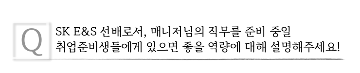 SK E&S의 수소부문 그리고 수소 Engineering그룹에 관심이 있는 취준생 분들이 있다면 대학교에서는 기본과목에 대한 지식을 함양하고 인턴 등의 과정을 통해 에너지 산업에 대한 현업경험을 쌓아보라고 말해드리고 싶습니다. 인턴 과정이 짧겠지만 이를 해보고 기업에 들어가는 것과 아닌 것은 큰 차이가 있습니다. 다양한 경험을 바탕으로 남들이 평가하는 직무, 직장이 아닌 본인이 하고 싶은, 그리고 잘할 수 있는 직무를 찾아서 좋은 결과가 있으면 하는 바람으로 인터뷰를 마치겠습니다.