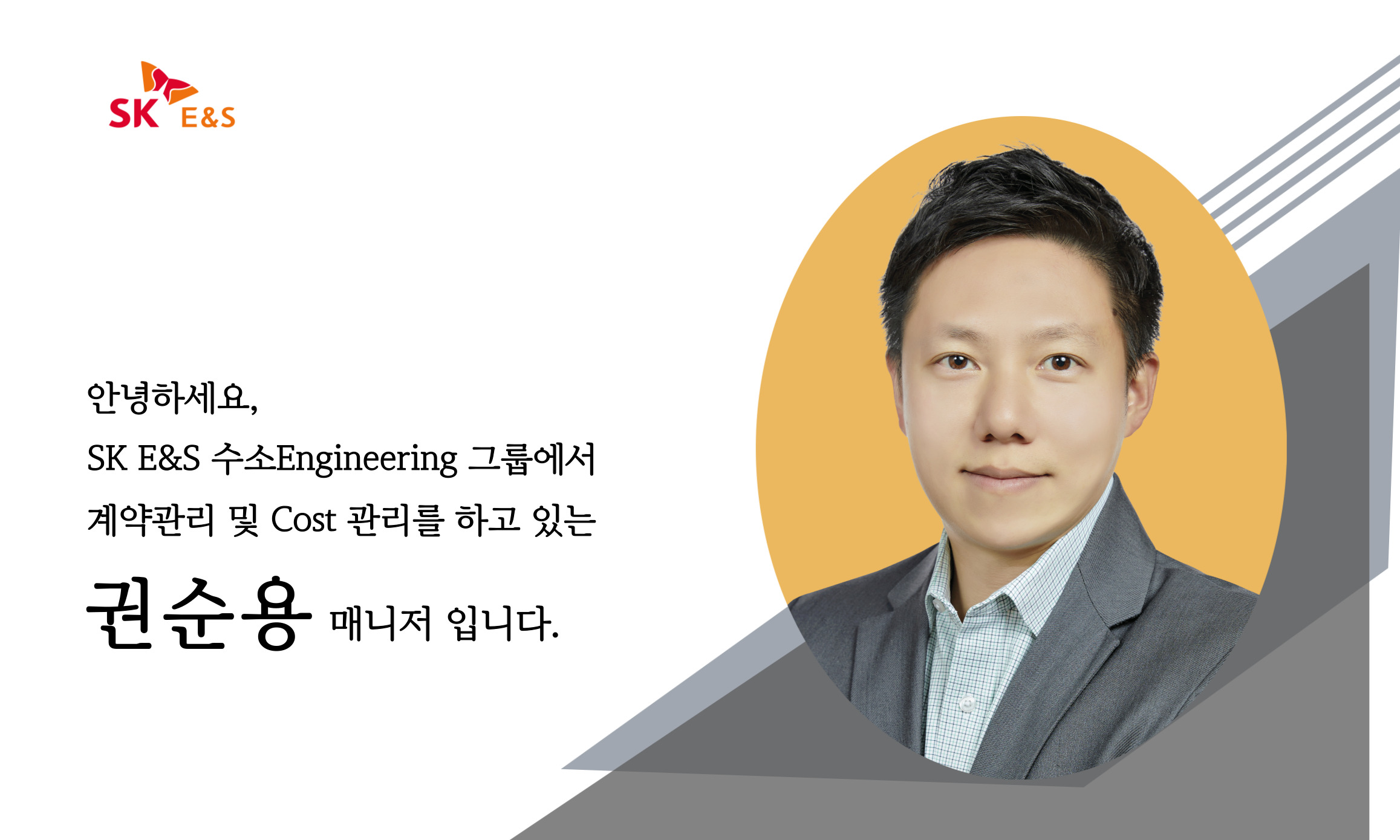 안녕하세요, SK E&S, 수소Engineering 그룹에서 인천 액화수소 플랜트 건설을 위해 계약관리 및 Cost 관리를 하고 있는 권순용 매니저입니다. 저는 계열사인 SK건설 (현 SK에코플랜트)에서 약 10년간 정유 및 석유화학 플랜트 공정 설계 엔지니어로 일을 했으며 2020년 12월 SK그룹에서 수소사업을 전사적으로 추진하며 ‘수소사업추진단’을 구성하게 될 때 합류하게 되었습니다. 이후 그룹 내에서 수소사업이 SK E&S로 이관되며 함께 계열사 이동하게 되었으며 총 3단계로 구성되는 SK E&S 수소사업 중 첫 단계인 인천 액화수소 플랜트 건설을 맡아 Project Control Manager로서 역무를 수행 중입니다.
