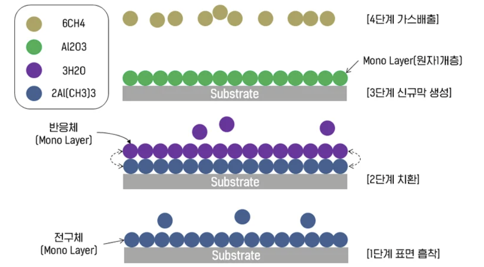 CVD/PVD와는 다르게 증착이 아닌 흡착방식을 활용하였고 2차 소스를 넣어서 흡착 물질과 화학적 치환이 일어나서 최종적으로 제3의 막이 한 층으로 형성됩니다. 결국 한 개의 새로운 층이 흡착되어 형성되는 것으로 볼 수 있습니다!