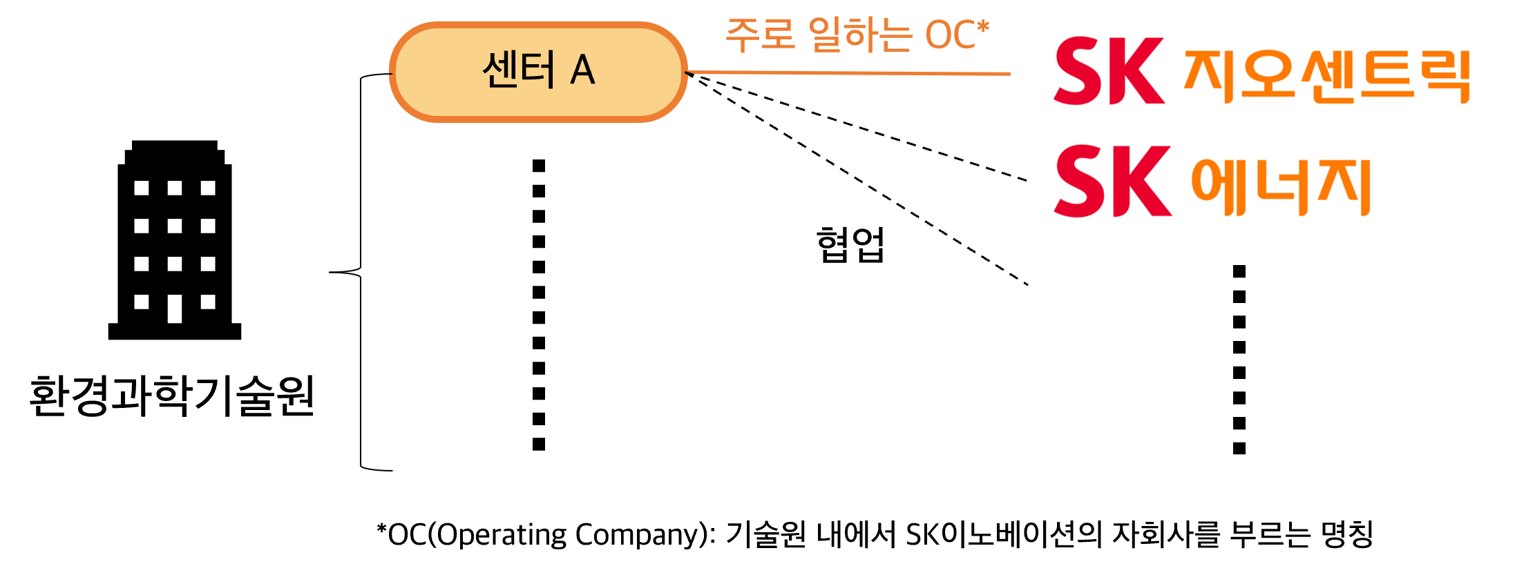 그림처럼 환경과학기술원의 센터 A가 SK이노베이션 자회사인 SK지오센트릭의 연구개발적 지원을 주로 돕는다고 하더라도, SK에너지, SK엔무브와 같은 다른 자회사들과 협업할 수도 있습니다.