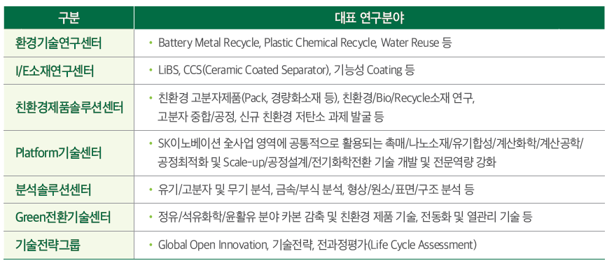 1) SK이노베이션은 이제 ‘정유사’가 아닌 ‘그린 에너지&소재 기업’(Green Energy & Materials Company)으로서, 연구 분야를 다양하게 확대하고 있음