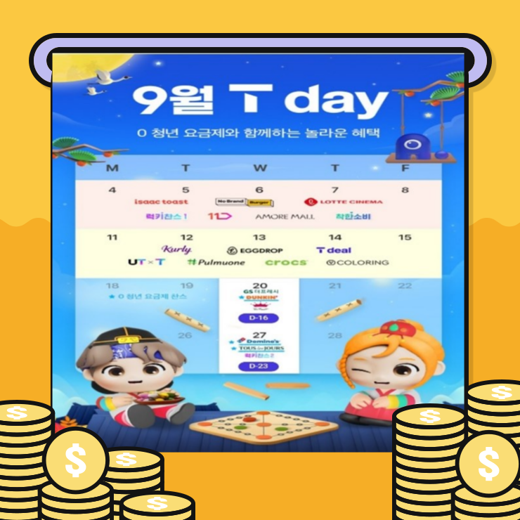 T모양인 날은 Tday로 빵빵한 혜택을 제공하는 날이라고 해요. 9월에는 롯데시네마, 크록스, 이삭 토스트, 11번가 등등 다양한 업체와 함께했습니다. 20곳에서나 혜택을 받을 수 있었고, 추석 선물까지도 다양한 업체에서 할인 받아 구매할 수 있었습니다. 무려 한 줄도 아닌 두 줄로 T 모양을 만듦으로써 혜택을 아낌없이 주고 있으니, 다들 매달 두둑이 혜택 챙겨가세요. 😉