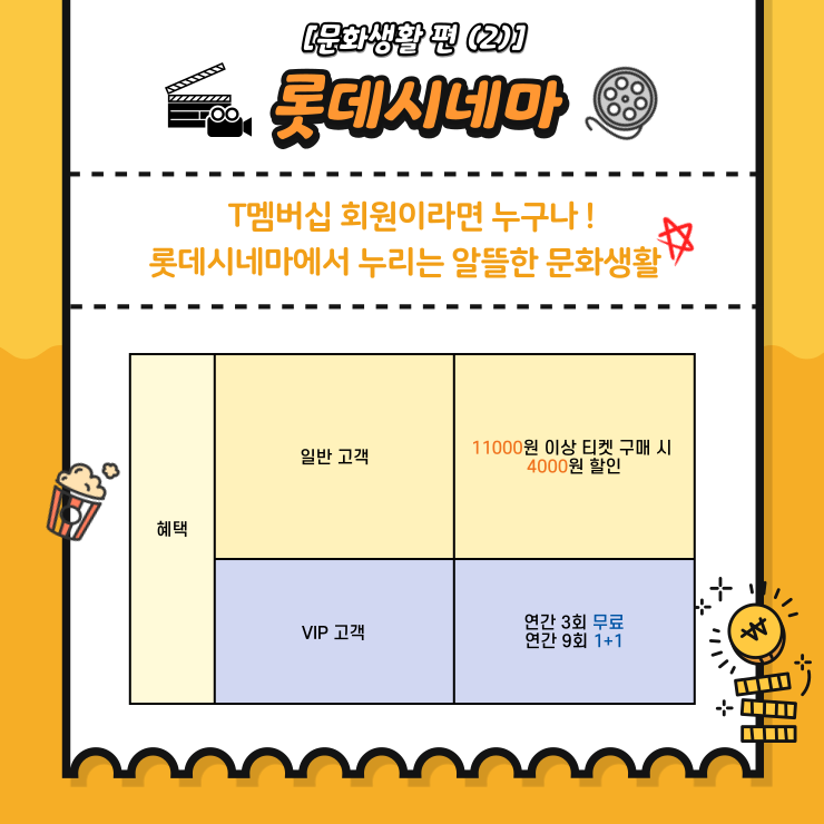 보고 싶은 영화가 OTT에 언제 나올지 하염없이 기다리는 건 그만! 혹시 T멤버십 혜택 중 영화 예매 할인 및 무료 제공 혜택이 존재한다는 점, 다들 알고 계셨나요? T멤버십 회원이라면 롯데시네마에서 11,000원 이상 티켓 구매 시 최대 4,000원까지 할인을 받을 수 있고, 심지어 VIP 고객이라면 연간 3회 무료, 연간 9회 평일 티켓 1+1으로 연 12회 혜택을 누릴 수 있답니다.🎬🍿