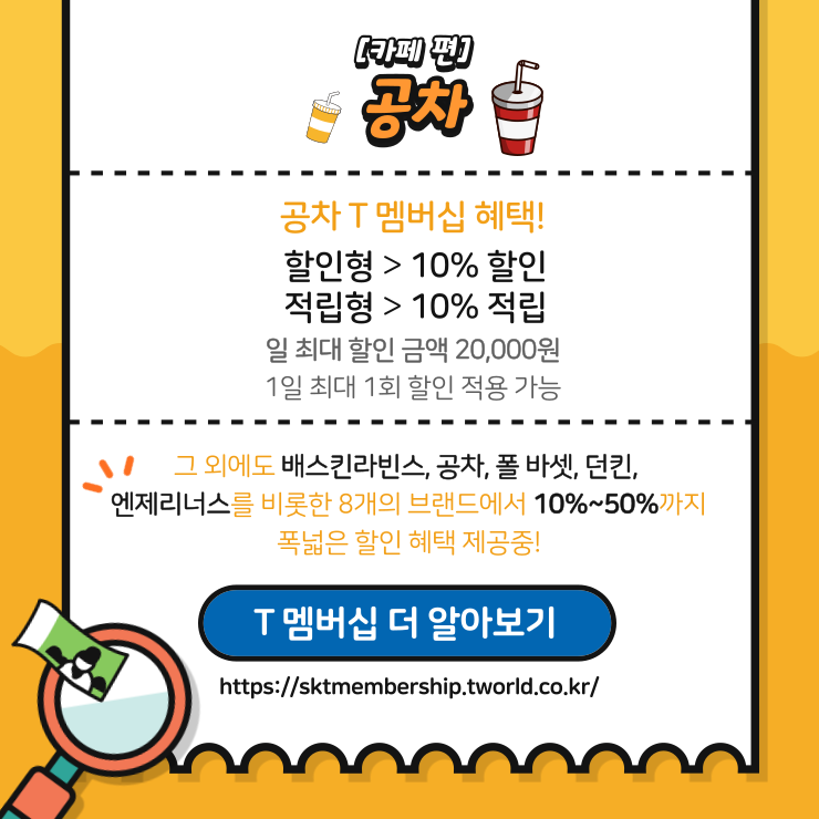 올해 여름은 유독 덥게 느껴진 것 같습니다. 이렇게 더운 여름철에는 종종 시원한 음료 한 잔이 그리워지지 않으시나요? 카페는 친구들과 함께 즐겁게 시간을 보내거나 공부하는 등 일상의 한 부분을 차지하는 익숙한 공간이 되었습니다. 여기서 잠깐! 이렇게 우리가 매일 방문하는 카페에서도 T멤버십을 활용해 할인 혜택을 받을 수 있다는 사실, 다들 알고 계셨나요?🥤