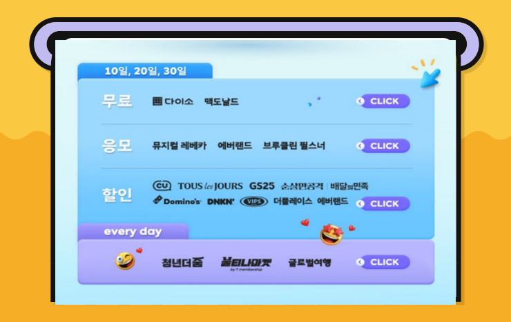 T멤버십으로 알뜰하게 전시, 영화, 밥, 디저트까지 즐기는 방법을 알아봤는데요! T멤버십과 함께한 에디터들은 홍대에서 무려 16,650원이나 절약할 수 있었답니다. 근데 여러분 놀라운 건 정말 아낌없이 퍼주는 T멤버십의 혜택이 여기서 끝이 아니라는 점이죠! T멤버십에서는 추가 혜택을 주는 날이 있습니다!