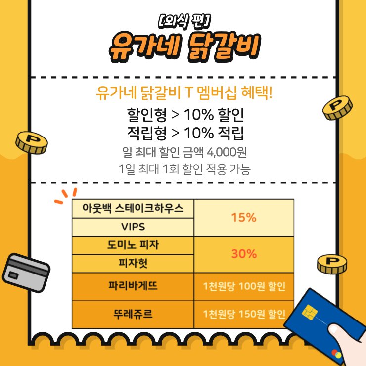 T멤버십 회원이라면 소개해 드린 유가네 닭갈비를 포함하여 • 아웃백 스테이크 하우스·VIPS·롯데리아 등 10개의 외식 브랜드, • 도미노피자·피자헛 등 4개의 피자/치킨 브랜드, • 파리바게뜨·뚜레쥬르 등 5개의 베이커리 브랜드에서 풍성한 브랜드 혜택을 누릴 수 있어요. 보시는 것과 같이 한식, 양식, 간단한 베이커리 종류까지 선택의 폭이 넓어 그날의 선호에 따라 메뉴를 고민하는 것도 가능하답니다.