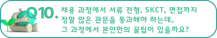 방지현 프로님 : 무엇보다 많은 연습이 필요한 것 같아요. 서류, 인·적성검사, 면접 가릴 것 없이 여러 번 연습하는 것이 가장 큰 도움이 되는 것이 사실이에요. 그러니 혼자서 모든 것을 준비하기보다는 다양한 사람들을 만나면서 도움을 주고받는 것이 좋다고 생각합니다. 스스로 더 나은 방향으로 발전할 수 있도록, 회사에 적합한 인재가 될 수 있도록 노력하는 것이 중요하다고 말씀드리고 싶어요.