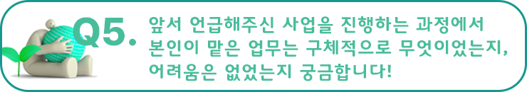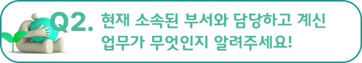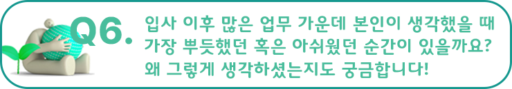 한도은 프로님 : 마찬가지로 저도 시간이 정말 빠르게 지나간 것 같아요. 처음에는 업무를 잘 해낼 수 있을까 하는 두려운 마음이 컸었는데 소장님, 팀장님 그리고 다른 프로님들의 도움으로 많이 성장한 것 같습니다. 아직 많이 부족하지만 스스로 해결해 나가는 일이 생길 때마다 뿌듯한 마음도 많이 들고 앞으로 제 업무 영역을 많이 넓혀갈 수 있도록 열심히 배워야겠다고 생각하고 있어요.