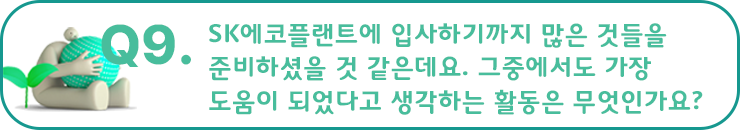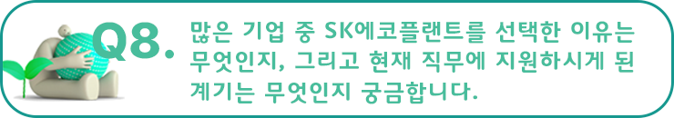 한도은 프로님 : 결정적으로 SK에코플랜트를 선택하게 된 것은 미래를 바라보는 방향성이 같다고 생각했기 때문이었어요. 이전까지 안정적으로 쌓아온 기업의 포트폴리오가 존재하는데도 불구하고 미래의 성장 가능성과 기업으로서 사회문제를 해결할 수 있는 방안을 제시하기 위해 환경 기업으로 전환한 것이 제게는 가장 큰 중요 포인트가 아니었나 생각합니다. 이렇게 현재에 안주하지 않고 새로운 도전을 통해 더 나아갈 방안을 찾고자 하는 모습이 제 삶의 방향성과 같다고 생각했습니다.