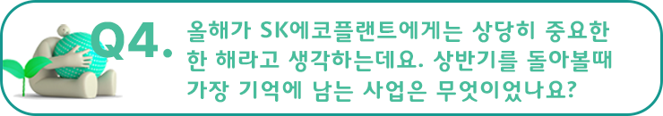 한도은 프로님 : 회사가 진행하는 다양한 사업 중 기억에 남는 것은 삼강엠엔티의 자회사 편입(*현 SK오션플랜트)인데요. 지금까지 SK에코플랜트가 다양한 환경기업을 인수했지만, 이렇게 한 기업이 사명을 변경하고 새로운 관계사로 역할을 시작하게 된 적은 없었어요. 그러다 보니 더욱 많은 분이 관심을 가지고 지켜보시는 것 같아요. 이렇게 새로운 사업과 기존의 건설업 역량을 잘 결합하고 있어서 SK에코플랜트가 환경, 에너지 기업으로서 변화하며 지속가능한 미래에 앞으로도 크게 기여할 수 있는 것 같습니다. 저도 그 일원으로서 자부심을 가지고 있고요.