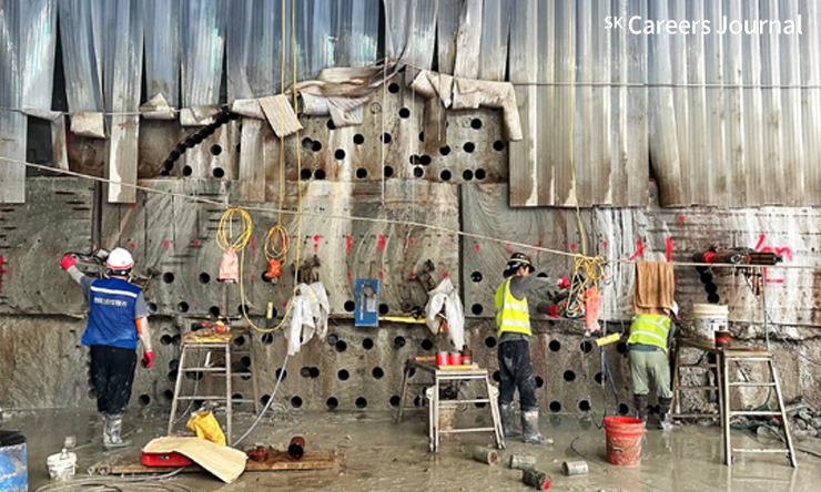 강현진 프로님 : 현재 복구공사 현장에서 신구접합(*신터널과 구터널을 접합)파트 중 D-Wall 파쇄 및 동결토 굴착 업무(*신터널과 구터널을 구분하는 가벽체를 만든 뒤 동결공법으로 얼린 흙을 모두 제거하고 터널을 연결하는 작업)를 맡고 있어요. 일반적으로 공사를 진행하기 이전에 시공계획서나 예정 공정표를 바탕으로 다양한 작업이 선행되고 해당 공사에 대한 경험이 있으신 분들 위주로 진행되는데, 제가 맡은 파트는 일반적인 작업이 아니다 보니 해당 공사에 관한 사례가 없어서 조금 어려움이 있습니다. 하지만 소장님과 각 파트 팀장님들이 잘 이끌어 주셔서 배움의 자세로 즐겁게 근무하고 있어요.