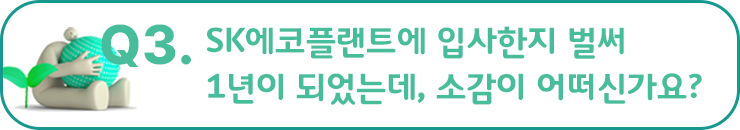 한도은 프로님 : SK에코플랜트의 일원으로 보냈던 지난 1년은 행복을 가득 채우고 자부심을 가질 수 있는 시간이었어요. 서로를 존중해주는 좋은 사람들과 함께 성장해 나갈 수 있고 미래를 기대할 수 있게 해주는 곳이라고 생각합니다. 앞으로도 많은 관심 가져주시고 응원해주셨으면 좋겠습니다.