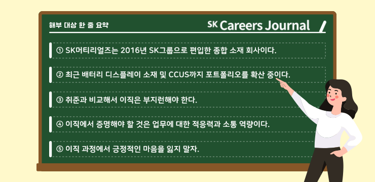 머해? 머티리얼즈 해부하기! SK Careers Journal을 보는 이직 준비생 여러분 모두 집중해주세요! 이번시간에 여러분과 함께 해부할 대상은 바로 ‘SK머티리얼즈와 이직사원’입니다.