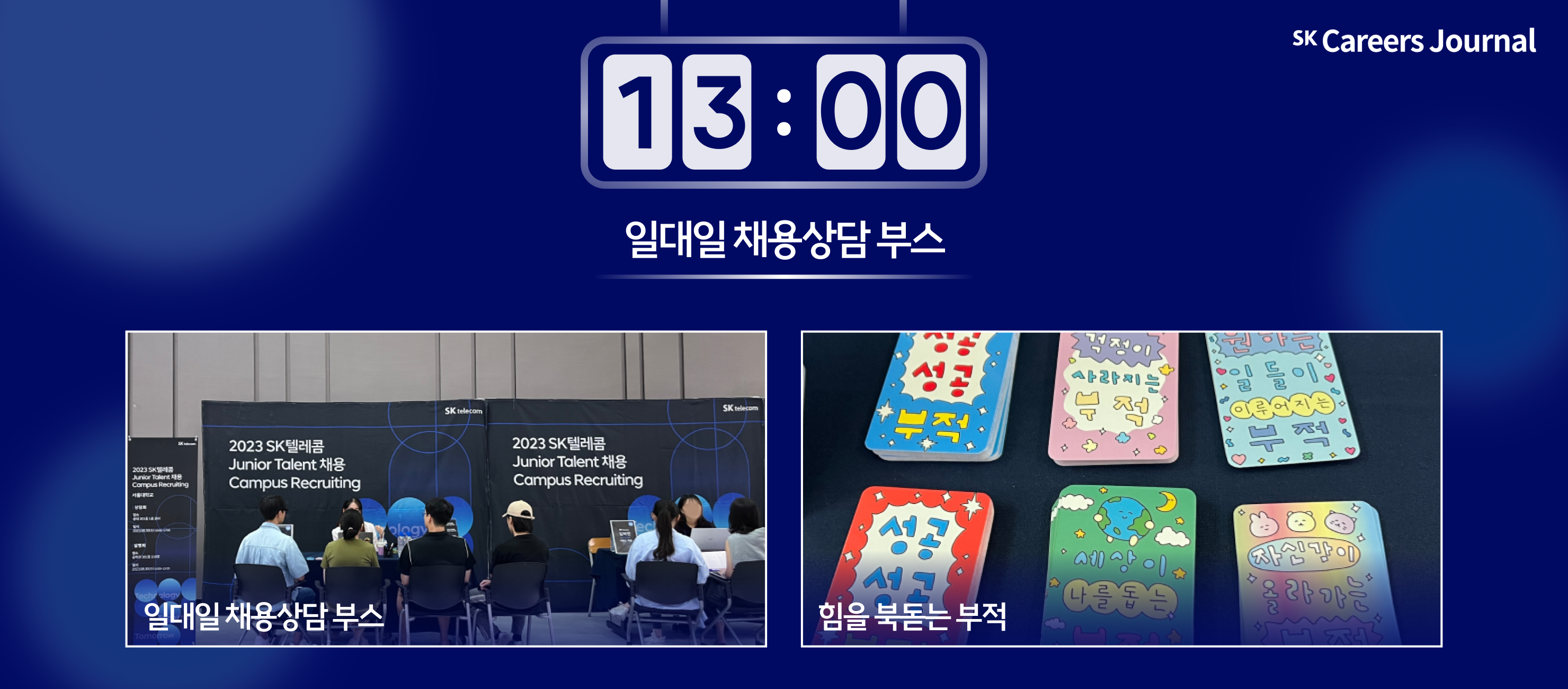 일대일 채용상담 부스는 SK텔레콤 JT 채용 담당자 한 분, 캠퍼스 리크루팅 진행 학교 동문의 직군 현업 담당자 두 분 총 세분께서 진행해 주셨습니다.