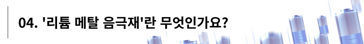 김태현 매니저 : 리튬 메탈 음극재는 기존의 흑연계 음극재 대비 용량이 약 10배 높은 고용량 소재로서, 이차전지 음극에 적용 시 고용량화가 가능합니다. 따라서 배터리가 효율적으로 압축되면서 EV(Electric Vehicle, 전기차) 적용 시 장거리 주행이 가능하다는 장점을 가집니다. 리튬은 다른 음극소재에 비해 무게 대비 용량(mAh/g)이 높아 배터리의 경량화 및 고용량화에 적합하여 각광받는 소재 중 하나입니다. 향후 전고체 배터리에도 적용이 가능한 차세대 음극재로 주목받고 있기도 합니다.
